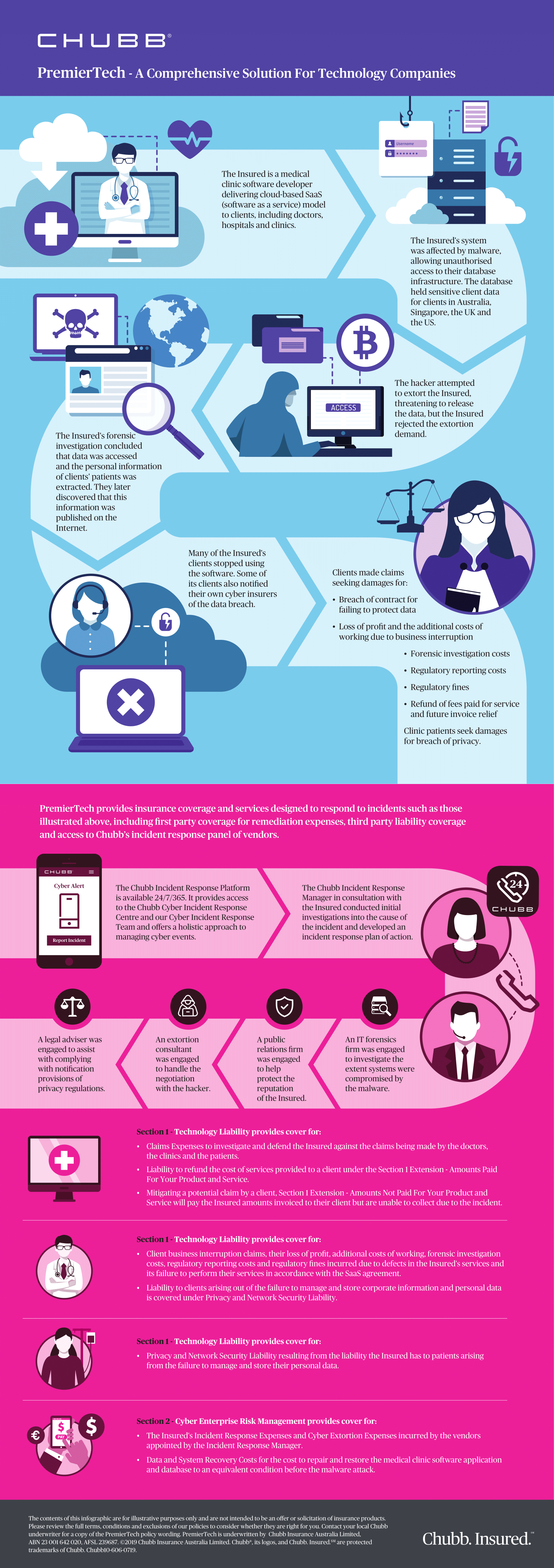 Chubb’s new PremierTech Policy Wording replaces the Chubb Premier Information and Network Technology Liability Insurance Policy by combining Chubb’s market leading IT Liability Package and Cyber Insurance capabilities into a new, single product. PremierTech features: