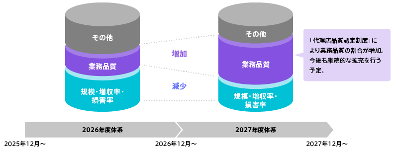 当社では、新たに代理店品質認定制度(お客様に対するサービスや顧客満足度向上を促進するため、代理店手数料体系における業務品質の評価指標を定めたもの)の運用を開始し、代理店手数料の算出にあたり「代理店の業績」と「業務品質」の両面で評価しています。さらに、お客様本位の業務運営を推進する観点から「業務品質」として複数の評価項目を設けていますが、今後も継続的な拡充を行う予定です。