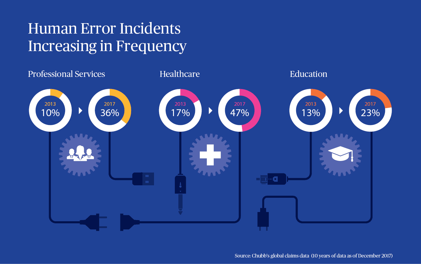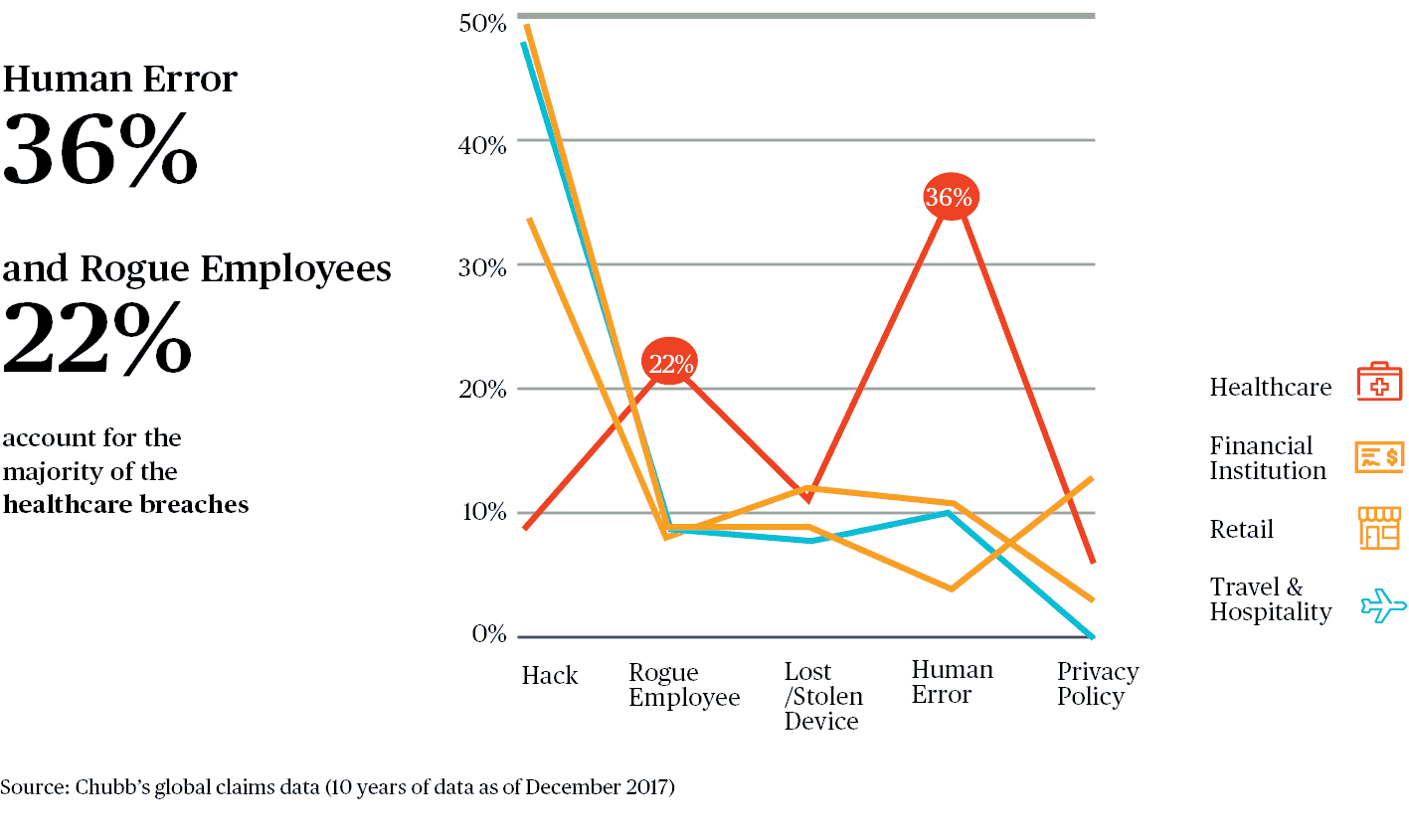 Based on an analysis of Chubb’s prior decade of claims experience, the healthcare industry made up 38% of all claims reported during that period. Further, the trend of incidents impacting the industry has continued into 2018 as the number of Chubb healthcare cyber-related incidents grew 13% over the past two years.